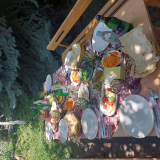 Danach gab es essen. Der Tisch stand unter einem Obstbaum im Schatten und war reichlich und bunt gedeckt. Hat gut geschmeckt.